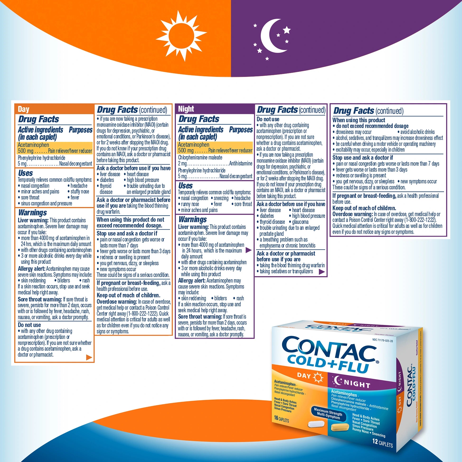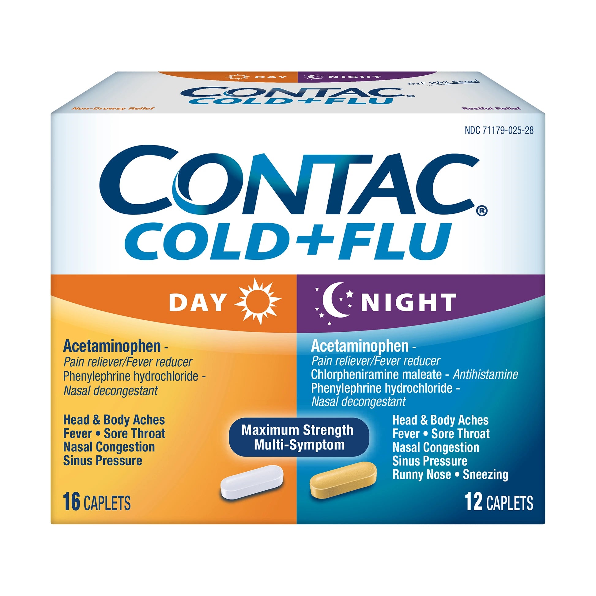 - TRUSTED BRAND: Contac has been trusted to relieve cold and flu symptoms for over 55 years - Choose one of our formulations depending on your cold, flu or cough symptoms: Contac Cold + Flu Daytime for non-drowsy relief, Contac Cold + Flu Day & Night for 24-hour relief, Contac Cough & Congestion to thin and loosen mucus and control your cough for 12 hours, and Contac Chest Congestion to thin and loosen mucus and make coughs more productive