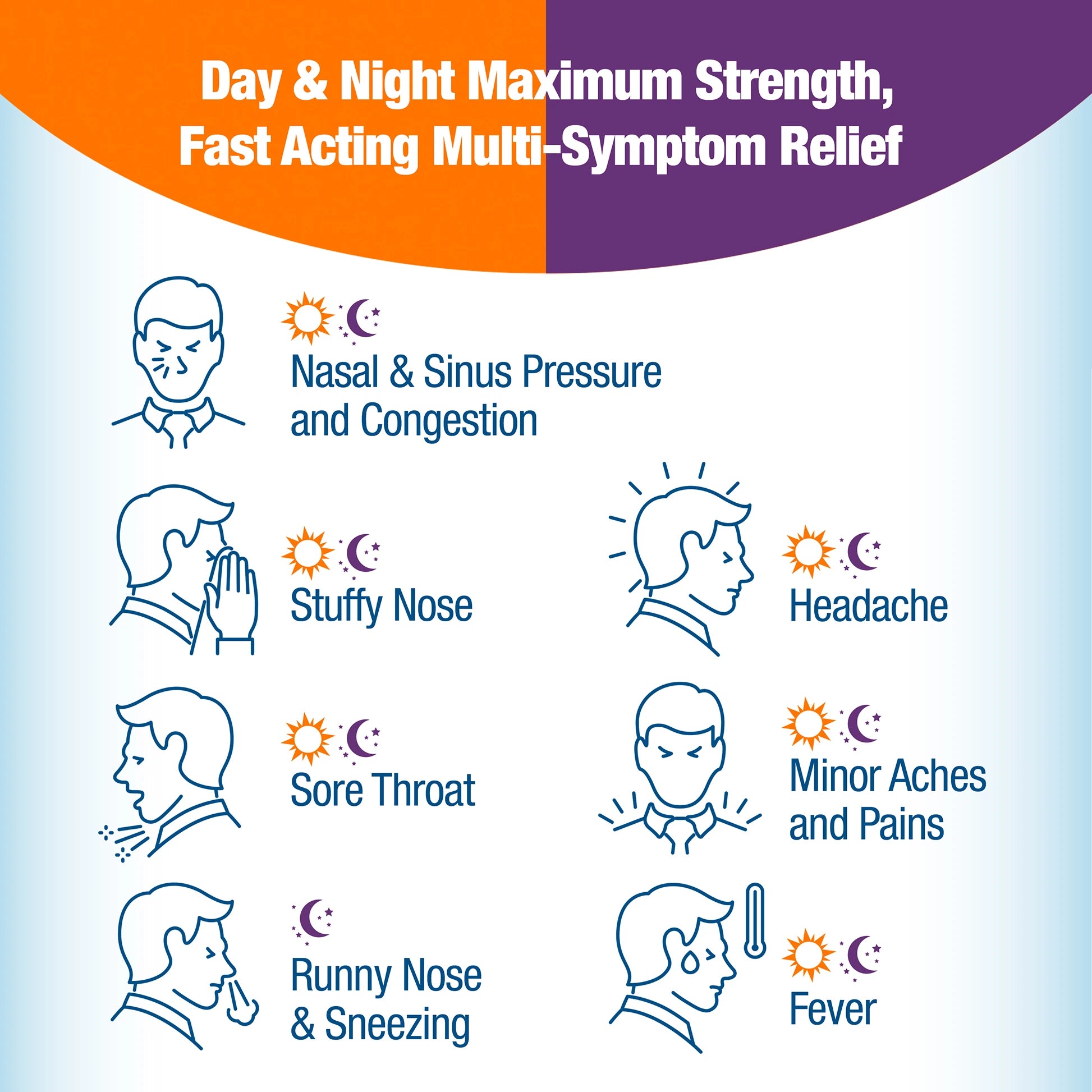 - FAST-ACTING, MAXIMUM-STRENGTH RELIEF: Get 24-hour relief from common cold & flu symptoms, including nasal congestion, sinus congestion and pressure, sore throat, head & body aches and fever, runny nose, and sneezing