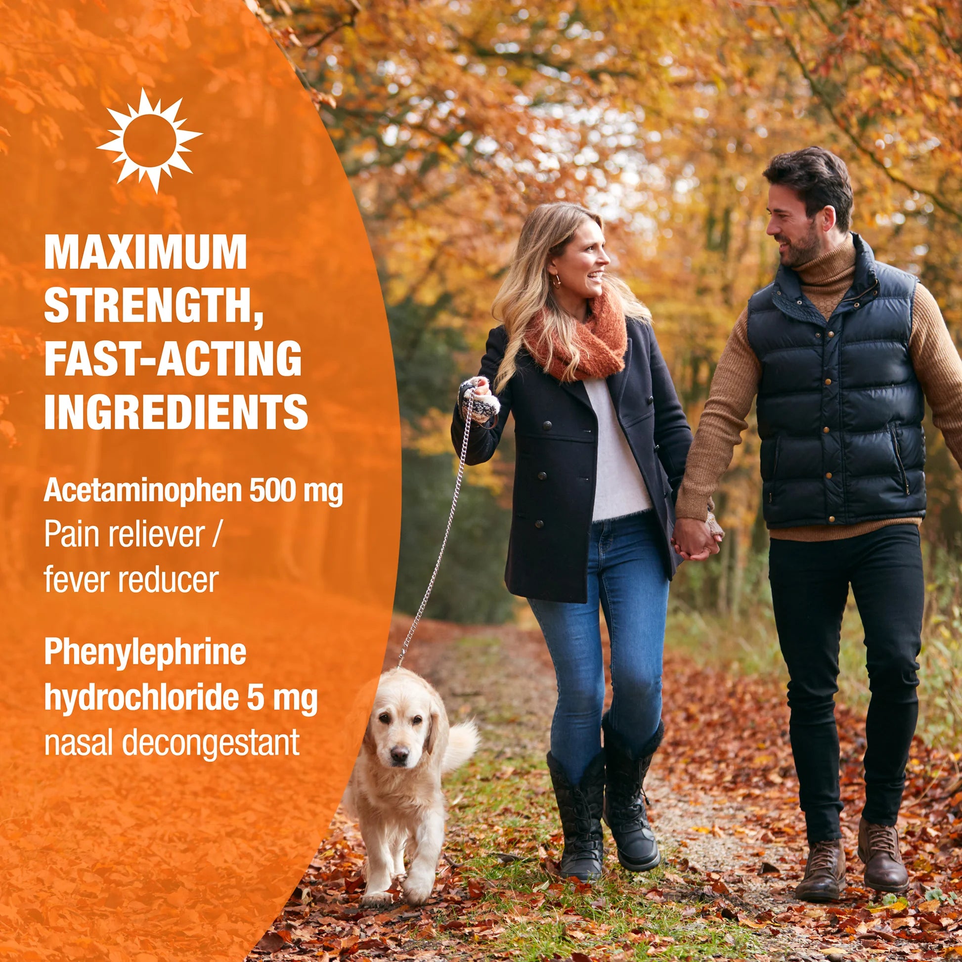 - FAST-ACTING, MAXIMUM-STRENGTH RELIEF: Experience rapid relief from cold and flu symptoms; Temporarily relieves common cold & flu symptoms, including nasal congestion, sinus congestion and pressure, sore throat, head & body aches and fever