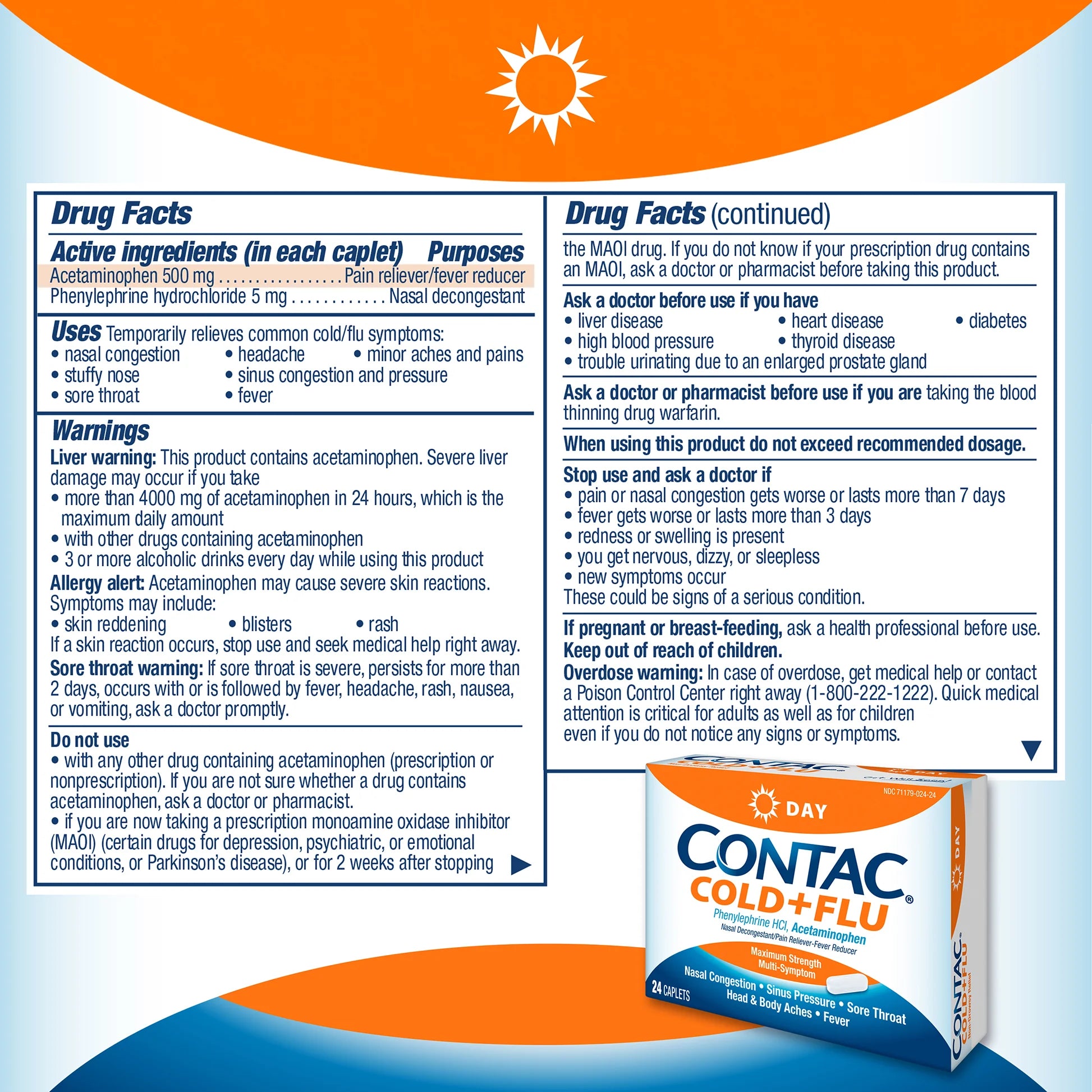Don't let colds and flu slow you down. With Contac Daytime Non-Drowsy Cold & Flu Relief caplets, you can seize the day with confidence, knowing that relief is just a caplet away. Our maximum strength daytime cold & flu medicine is specially designed to tackle the most bothersome cold and flu symptoms, offering you a fast-acting solution to nasal congestion, headaches, body aches, sore throat, and fever. Unlike other over-the-counter remedies, Contac Cold +Flu Daytime cold medicine ensures you stay alert and awake, thanks to our non-drowsy formulation. Perfect for those who need to stay on their game, whether it's a day at work, school, or just daily chores. Each pack contains 24 easy-to-swallow caplets, offering ample coverage for those unexpected sick days. Suitable for adults and children over 12, it’s an essential addition to every household’s medicine cabinet. Trust in the legacy of Contac – your partner in cold and flu relief. FSA/HSA eligible*. *Contact your healthcare provider.